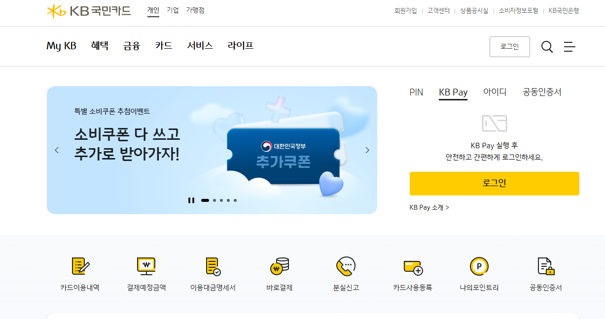 PIN 로그인 필수입력 항목입니다. 로그인 PIN 재설정 PIN 번호는 6자리 숫자만으로 로그인할 수 있는 안전한 인증 수단입니다. (브라우저당 1명만 이용) PIN 설정 KB Pay 로그인 KB Pay 실행 후 안전하고