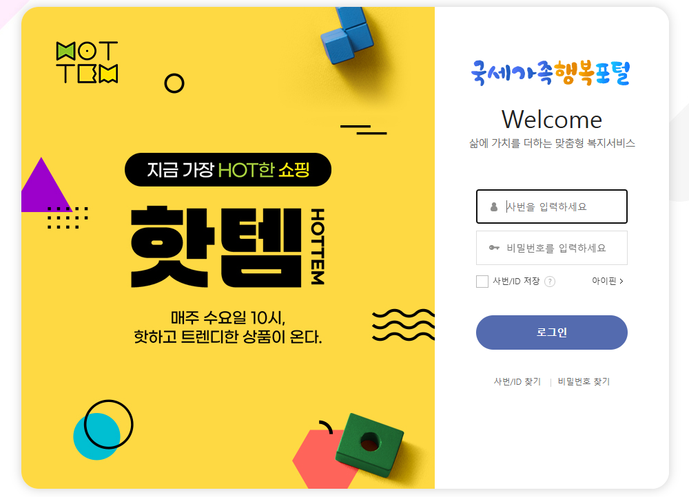 국세가족 행복포털은 폐쇄형 복지몰이므로 별도의 회원가입 없이 국세청에서 부여받은 사번과 비밀번호로 로그인해야 합니다.