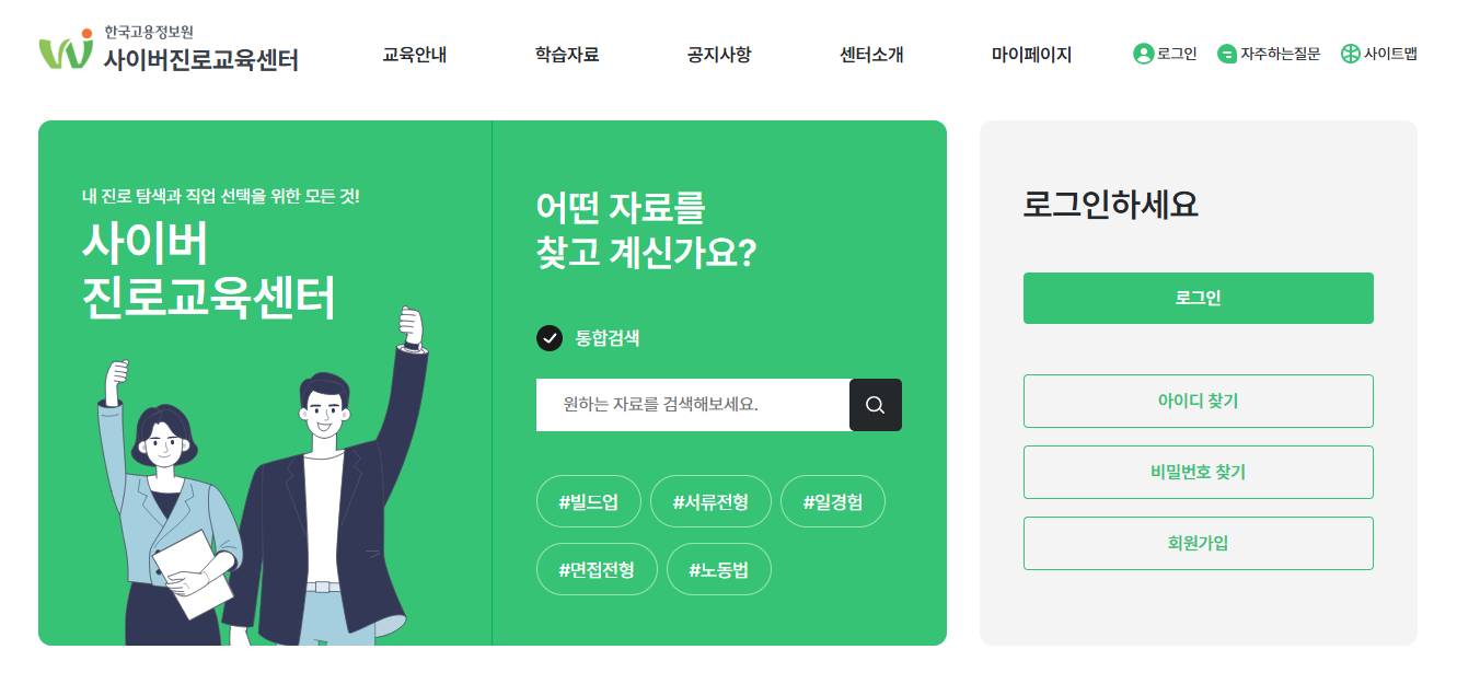 한국고용정보원 사이버진로교육센터는 2009년 개설된 온라인 진로지도 플랫폼으로, www.work.go.kr/cyberedu에서 운영되고 있습니다. 고용서비스 종사자, 청소년, 대학생 및 구직자에게 맞춤형 온·오프라인 교육을 무료로 제공하는 교육 플랫폼으로, 2021년 한 해에만 300만 명 이상이 방문하여 44만 명 이상이 온라인 교육을 수강했습니다.