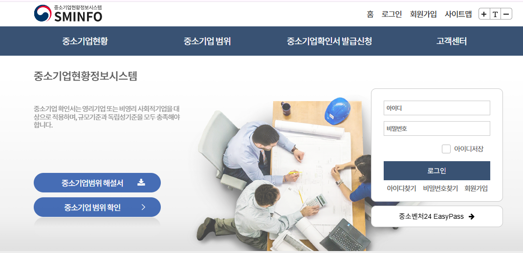 로그인 중소벤처24 EasyPass 중소기업현황정보시스템 중소기업 확인서는 영리기업 또는 비영리 사회적기업을 대상으로 적용하며, 규모기준과 독립성기준을 모두 충족해야 합니다.